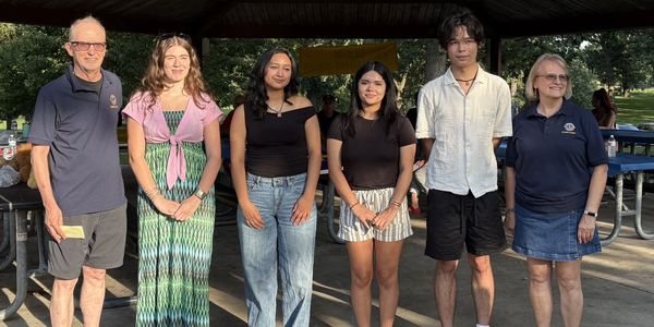 Photo is of two Foundation members and 2025 recipients: Lion Ed Bates (left) and Lion Sue Bruneau (right) with Emilia Plewa, Michelle Gonzalez, Elizabeth Cruz, and Aaron Corson (L to R).